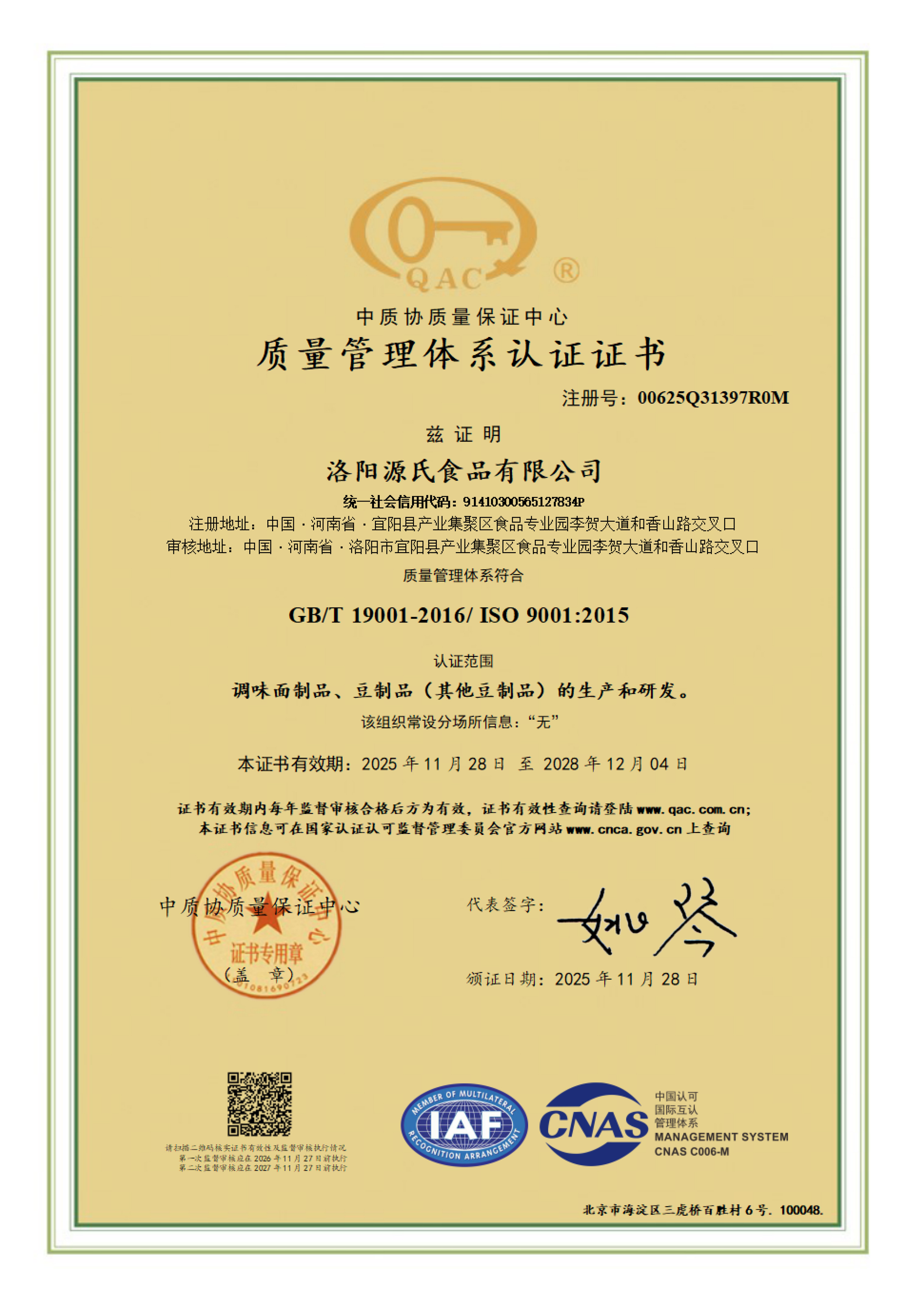 食品安全管理體系認(rèn)證證書